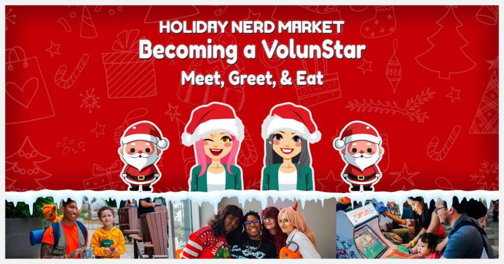 Are you interested in volunteering with other nerds and gamers? Did you just sign up and become a VolunStar? Or are you an OG? Come on out to learn about contributing to your local community and forge new relationships with good people as we get ready for the Holiday Nerd Market!